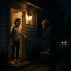 And yet, when I pee through the peepphole, there he was, my grandpa, standing alone on my porch in a frayed sweater, holding a beat up duffel bag in one hand and a pill organizer in the other. No coat, no phone, no smile, just a confused, tired man who looked like he’d been dragged through a storm and left to dry on my welcome mat. I yanked the door open.