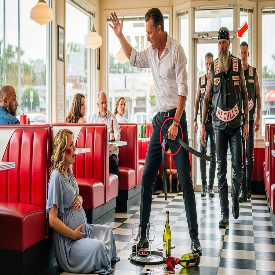 “Sit down!” he barked. She stumbled, her knees scraping the tile, her tears mixing with the spilled wine. “And then he lifted the belt. The sound of leather slicing the air made every heart stop. But before it could fall, before another blow could strike, the glass door of the diner swung open. The faint growl of motorcycle engines had gone unnoticed until then.